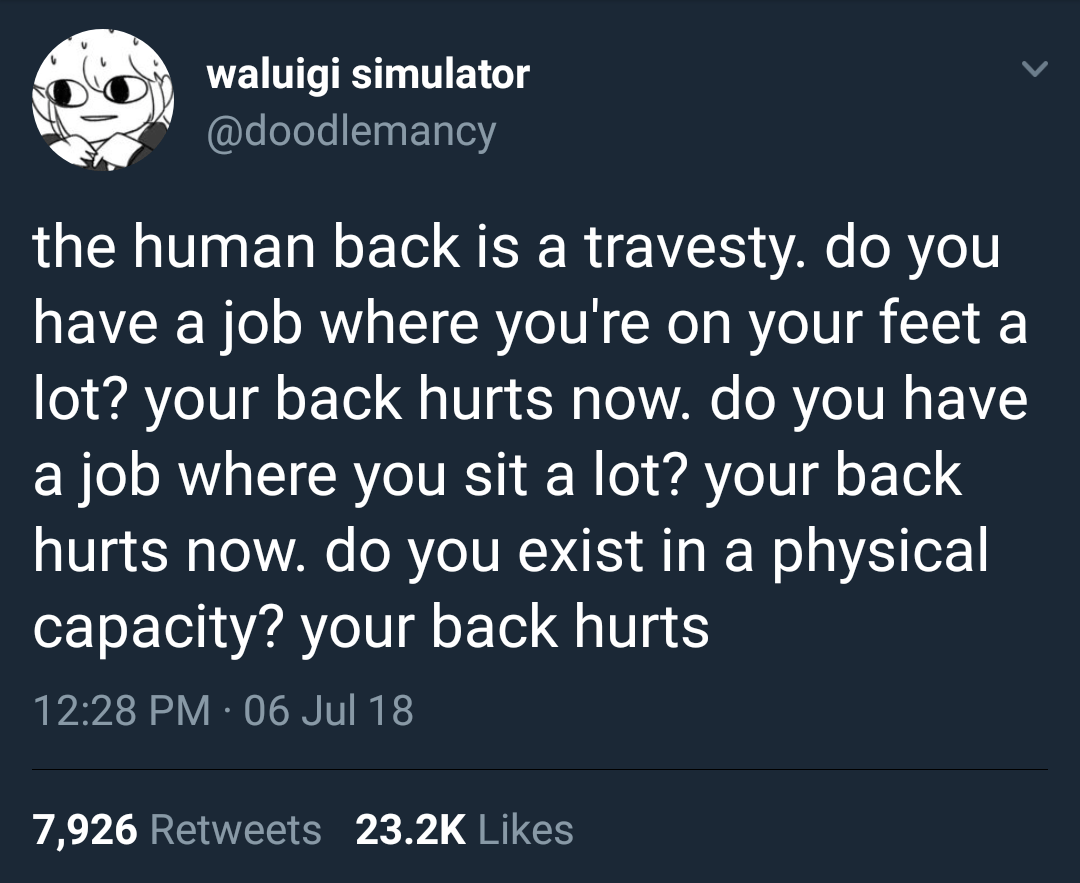 dawnmarierose Uncategorized July 9, 2018December 7, 2018 1 Minute whitepeopletwitter: life is back pain Share this: Share on X (Opens in new window) X Share on Facebook (Opens in new window) Facebook Like Loading... Related Published by dawnmarierose View all posts by dawnmarierose Published July 9, 2018December 7, 2018