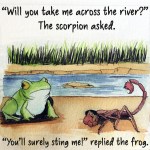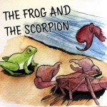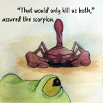 But if you don’t know the story… In the original the scorpion stings the frog in the middle of the river. When the frog asks “why” the scorpion says “it’s in my nature” and they both die. I like my ending more.